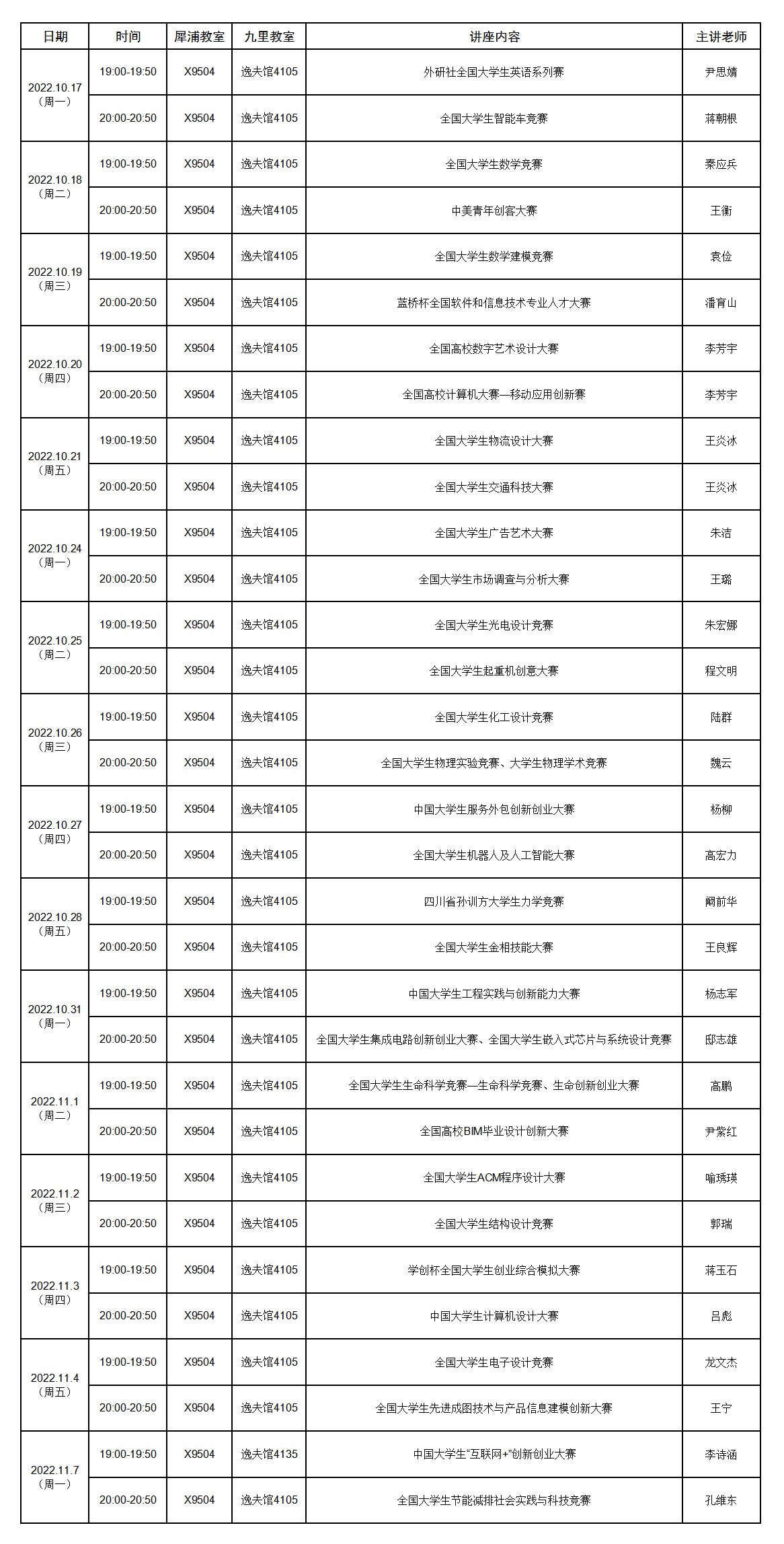 创新创业俱乐部承办的 2022—2023学年第一学期学科竞赛及创新创业活动讲座活动于2022年10月17日—2022年11月7日举行。