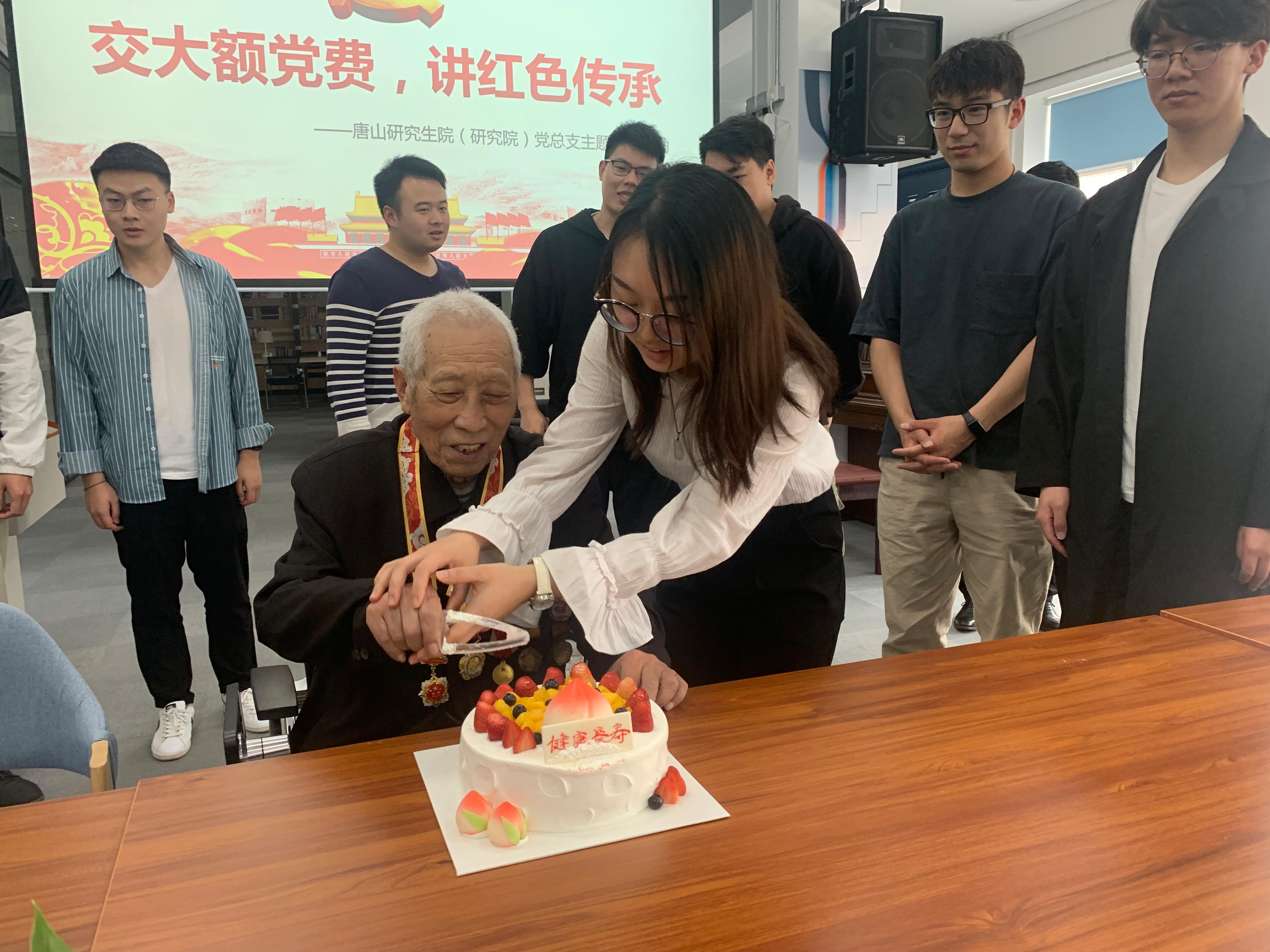 5月13日下午,唐山研究生院(研究院)党总支举办了一次特别的主题党日活动:耄耋党员张恩臣老师为党庆生,向党组织交上了一笔特殊的党费。唐山研究生院(研究院)师生党员代表参加此次活动。
