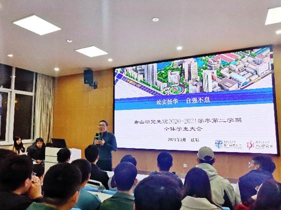 2021年3月3日晚,唐山研究生院在学校成都九里校区组织召开了2020-2021学年第二学期全体学生大会。唐山研究生院党总支书记刘伟,副院长吴刚、梁思颖,教学与学生工作办公室主任贾诚、综合办公室主任王韬参加了会议。会议由刘伟书记主持。