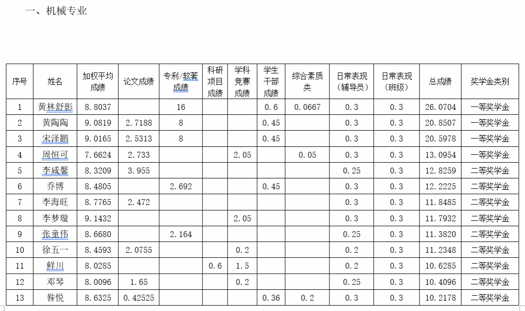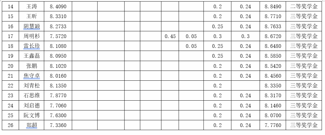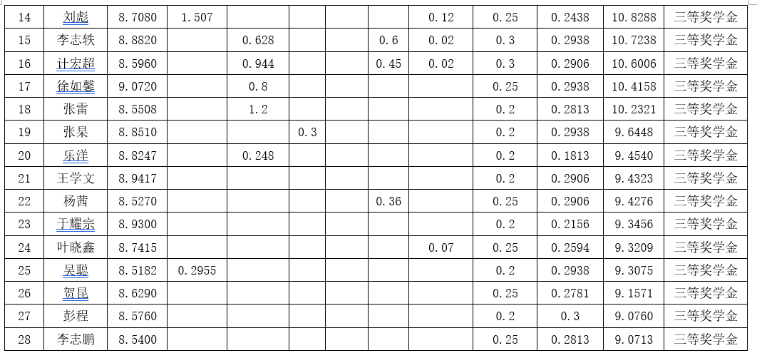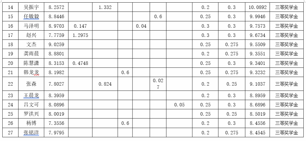 根据《91大神 研究生奖(助)学金评定办法》,按综合成绩排名确定最终获奖类别(综合成绩=学业成果成绩+思想道德素质评价成绩+第二学年综合成绩*10%),现将2021级2022-2023学年研究生学业奖学金获奖名单公示如下: