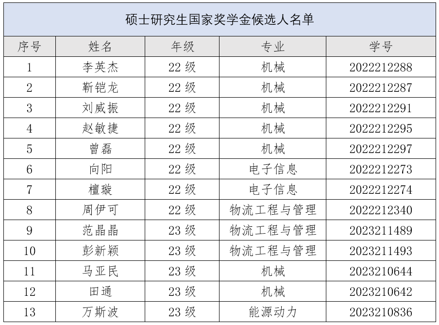 各硕士研究生国家奖学金候选人:
